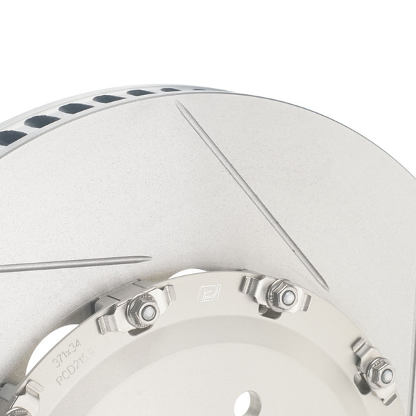 Paragon Performance 2-piece Rotor offers superior braking and cooling efficiency optimized for track and race applications. It features directional ventilation vanes to create suction, turbulence, and guides cool air through the rotor for improved heat dissipation and increased resistance to cracking under harsh track condition.