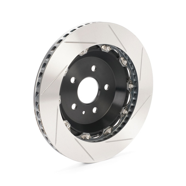 Vibration is reduced as the rotor lateral run-out is kept within 0.03mm and well-balanced: variations are kept within 2 grams. All rotors went through rigorous quality control procedures and inspections to ensure the rotors are fit for their purposes. The floating 2-piece design allows thermal expansion of the rotor while minimizing deformation and ensuring the rotor is self-centered with the pads. A slotted rotor improves braking consistency by maintaining a clean contact surface and dissipate heat generated and gases released when the pads come into contact with the rotors. Slotted rotors have a superior advantage over blank rotors in wet or raining conditions by preventing water films to form between the brake pad and rotor surface. Weighing less than most O.E. rotors while maintaining proper thermal capacity, our 2-piece rotors improves overall handling by saving unsprung mass.