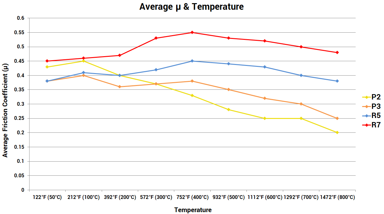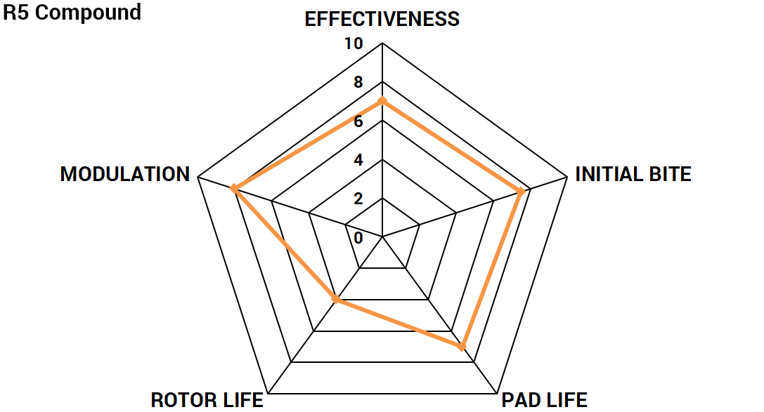 The R5 “High Friction Track / Competition” compound is designed as a dedicated track compound. High coefficient of friction provides sufficient stopping power for track and competition conditions. Precise modulation and release characteristics. Highly fade resistant with wide temperature range. Flatter torque curve compared to the R7 compound, providing consistent and solid braking performance throughout the effective temperature range which boosts driver’s confidence. Elevated noise and brake dust compared to P2 and P3 compounds. Relatively easy on rotors compared to competitors’ racing pad offerings. Great front pad option for lighter cars, and rear pad option for those who prefer a more front biased setup with the R7 compound up front.